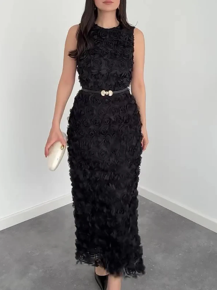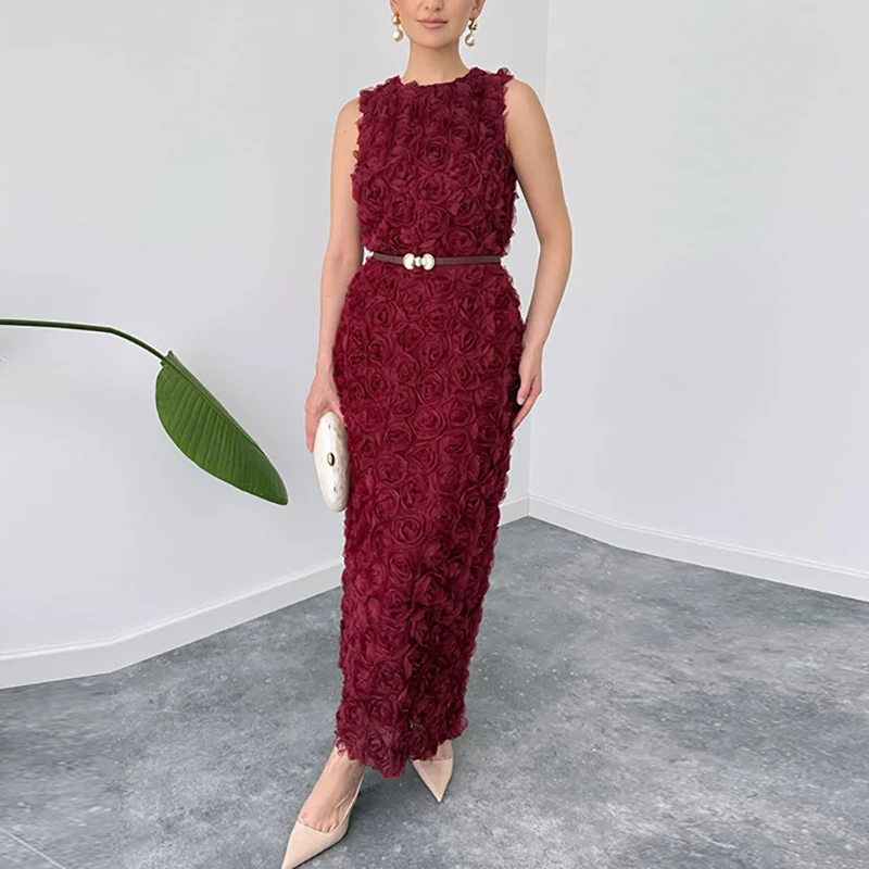 Home DRESSES MiraMuze Fashion Temperament Long Dress Three-Dimensional Flower Solid Slim A-Line Dress 2025 Elegant Lady O-Neck Sleeveless Party Dress