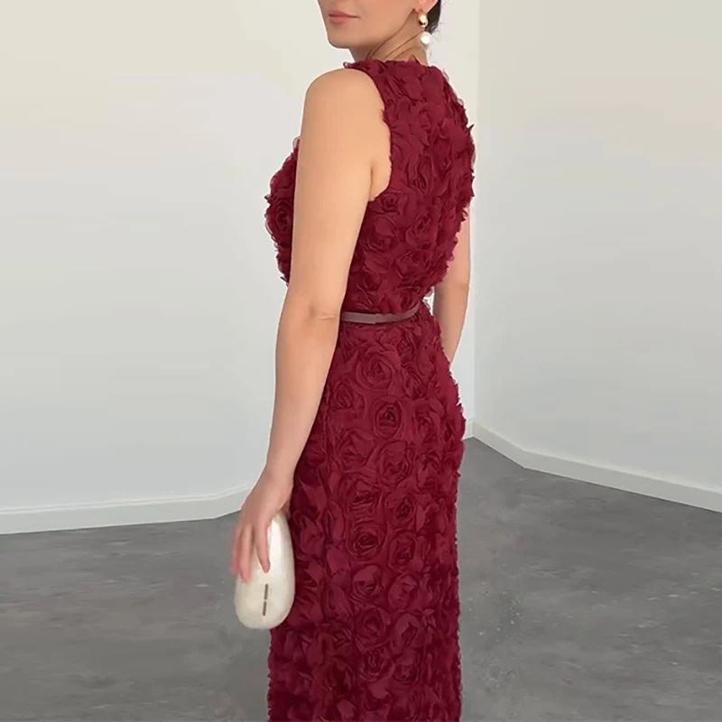 MiraMuze Fashion Temperament Long Dress Three-Dimensional Flower Solid Slim A-Line Dress 2025 Elegant Lady O-Neck Sleeveless Party Dress - Image 5
