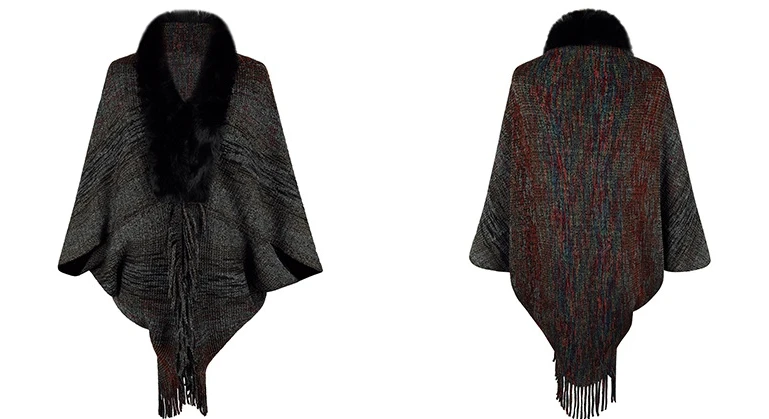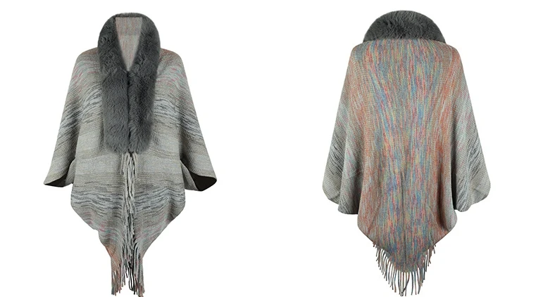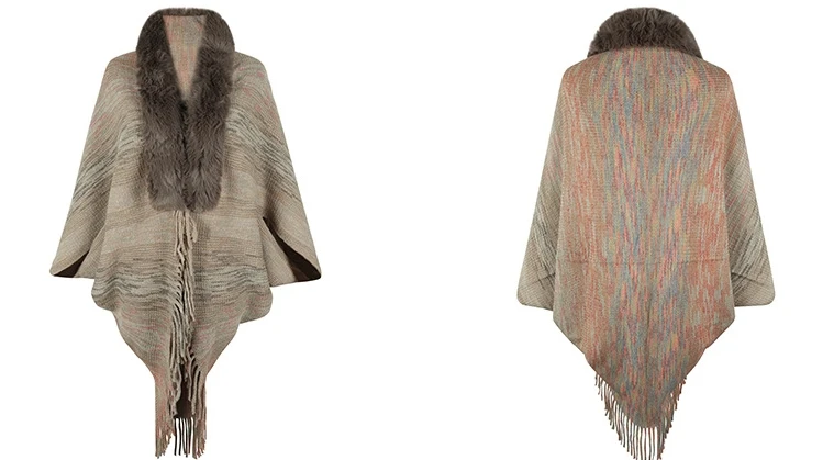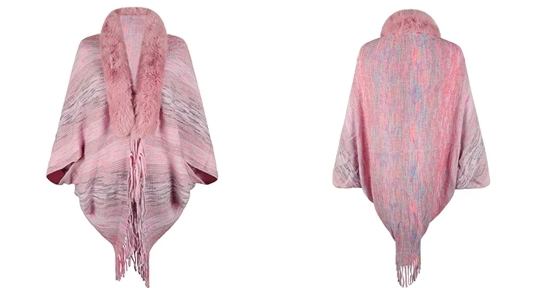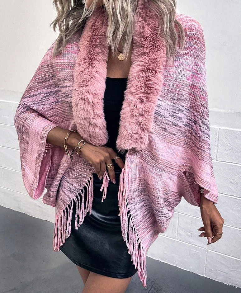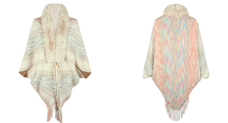 Women’s Elegant Coat 2025 Autumn Winter Latest Rainbow Striped Tassel Cape Hairy Neck Knitted Shawl Tie Dyeing Cardigan Top