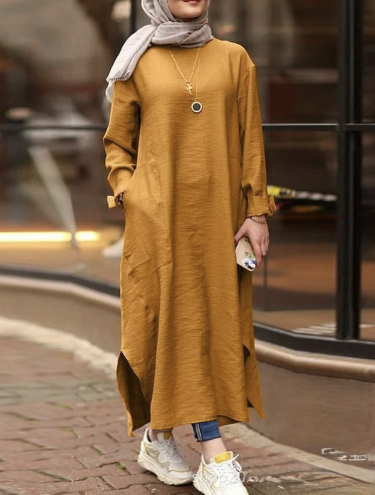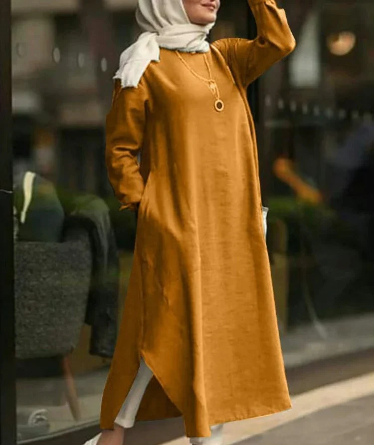 MiraMuze Muslim Women’s Long Top Dress Abaya Split Midi Dress Full Sleeve Female Solid Pockets Robe