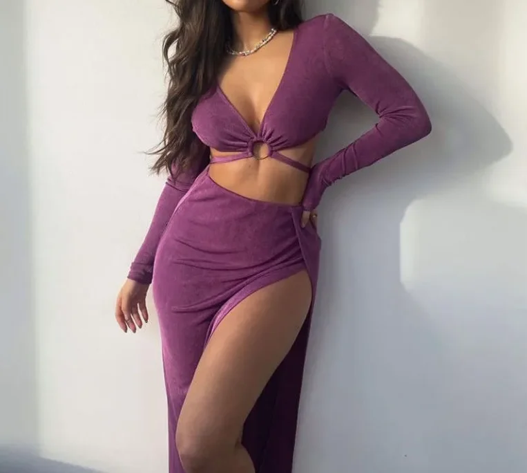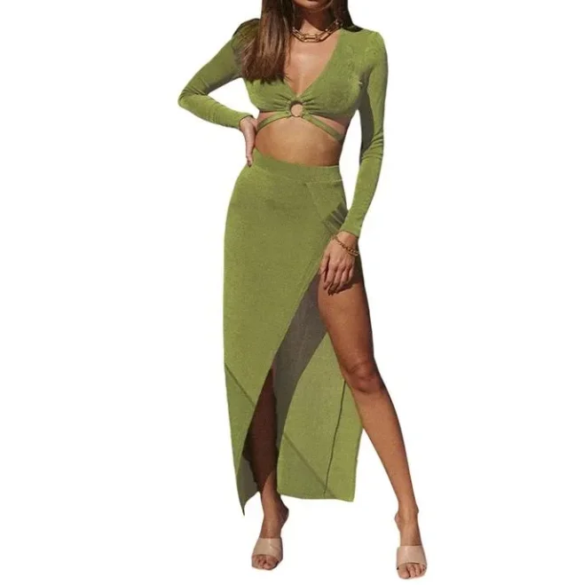 Home DRESSES MiraMuze Sexy 2-Piece Sets for Women 2025 Dress V-Neck Long Sleeved Circular Decor Short Top High Waist Slit Tight Sexy Skirt Set