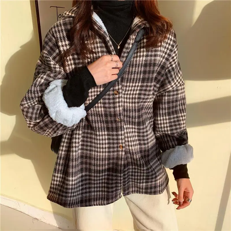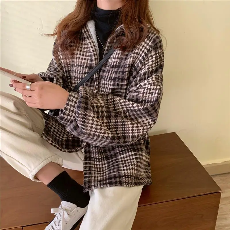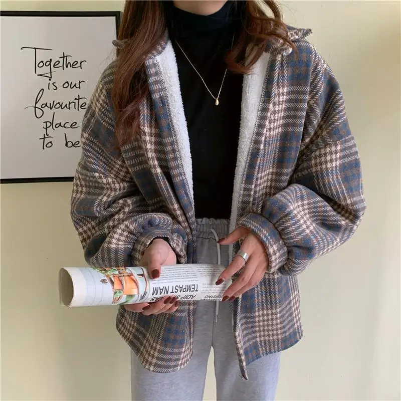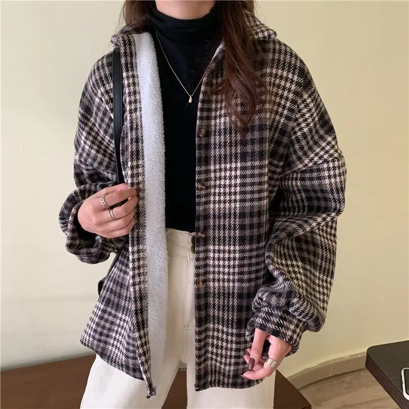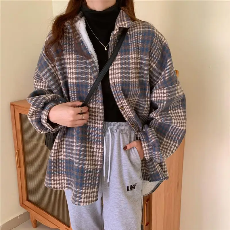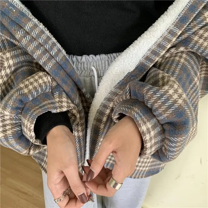 Home Jackets & Coats MiraMuze Velvet Thick Warm Women’s Plaid Shirt Female Stripe Long Sleeve Tops Winter Fleece Casual Check Blouse Autumn