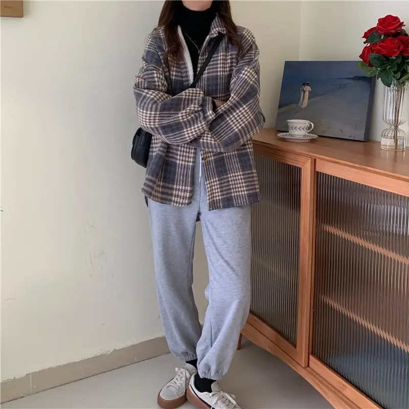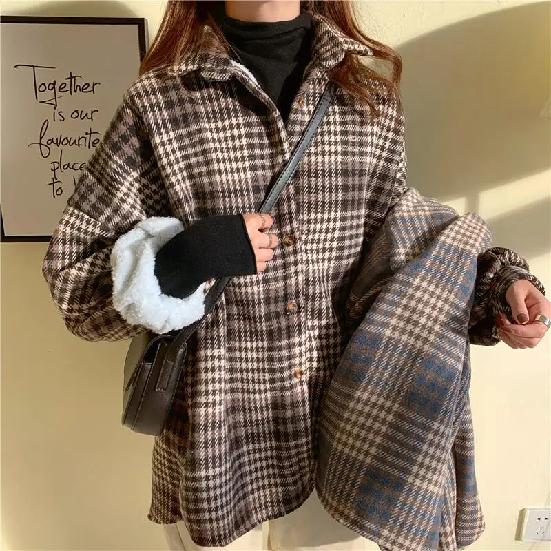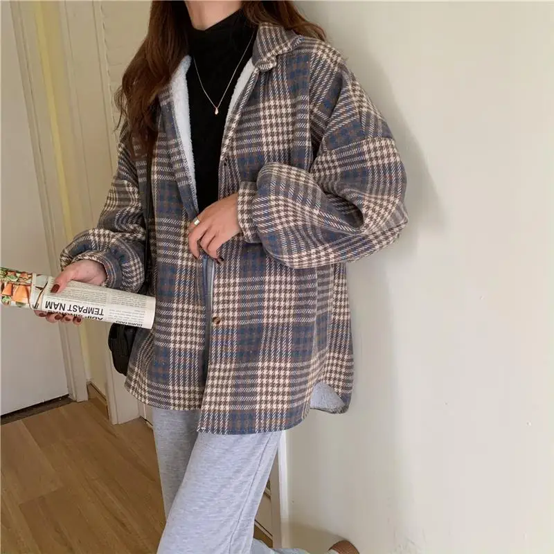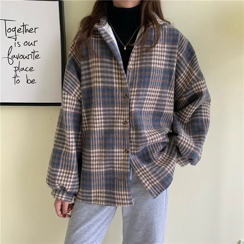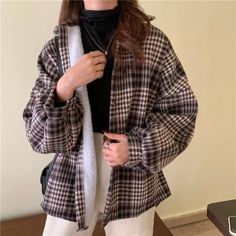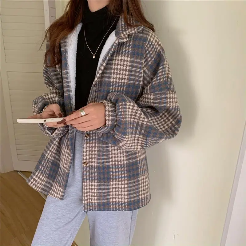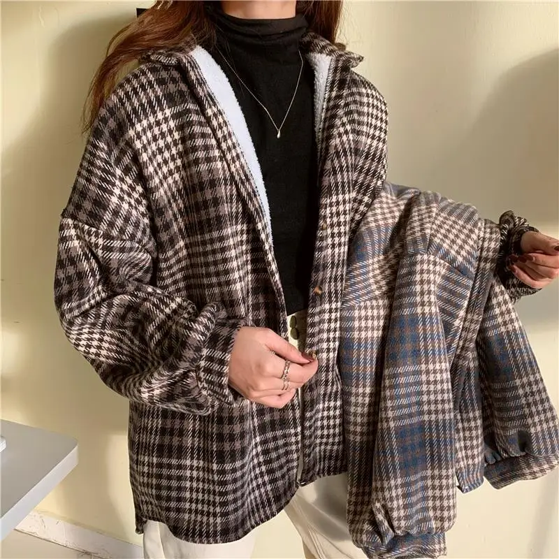 Home Jackets & Coats MiraMuze Velvet Thick Warm Women’s Plaid Shirt Female Stripe Long Sleeve Tops Winter Fleece Casual Check Blouse Autumn